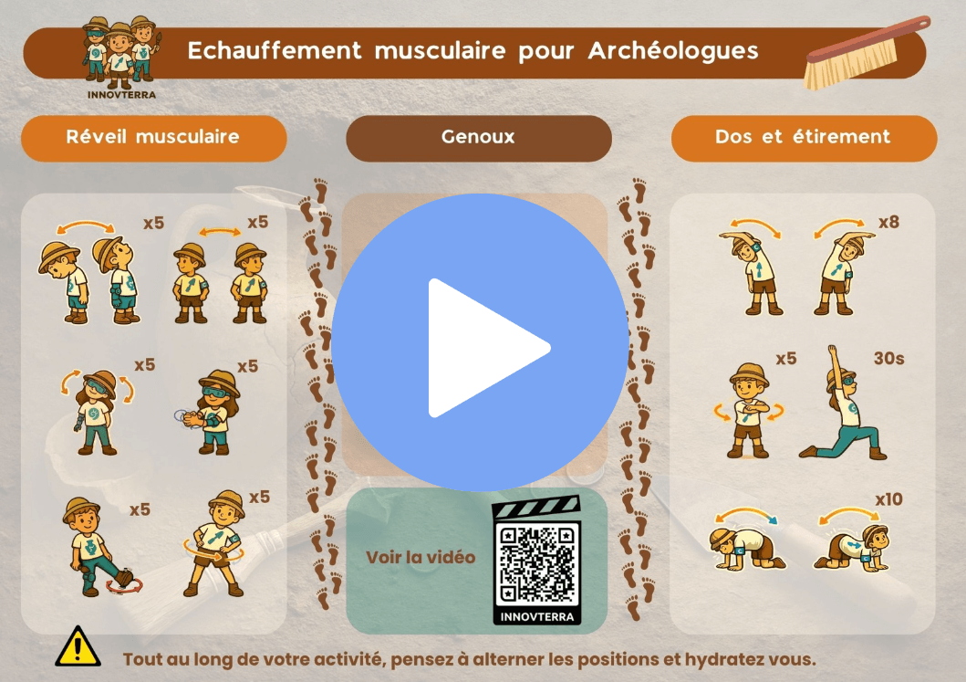 Nous avons développé une routine d’échauffement spécialement adaptée aux gestes des archéologues, pour préparer le corps avant de commencer les fouilles et réduire les risques de blessures.